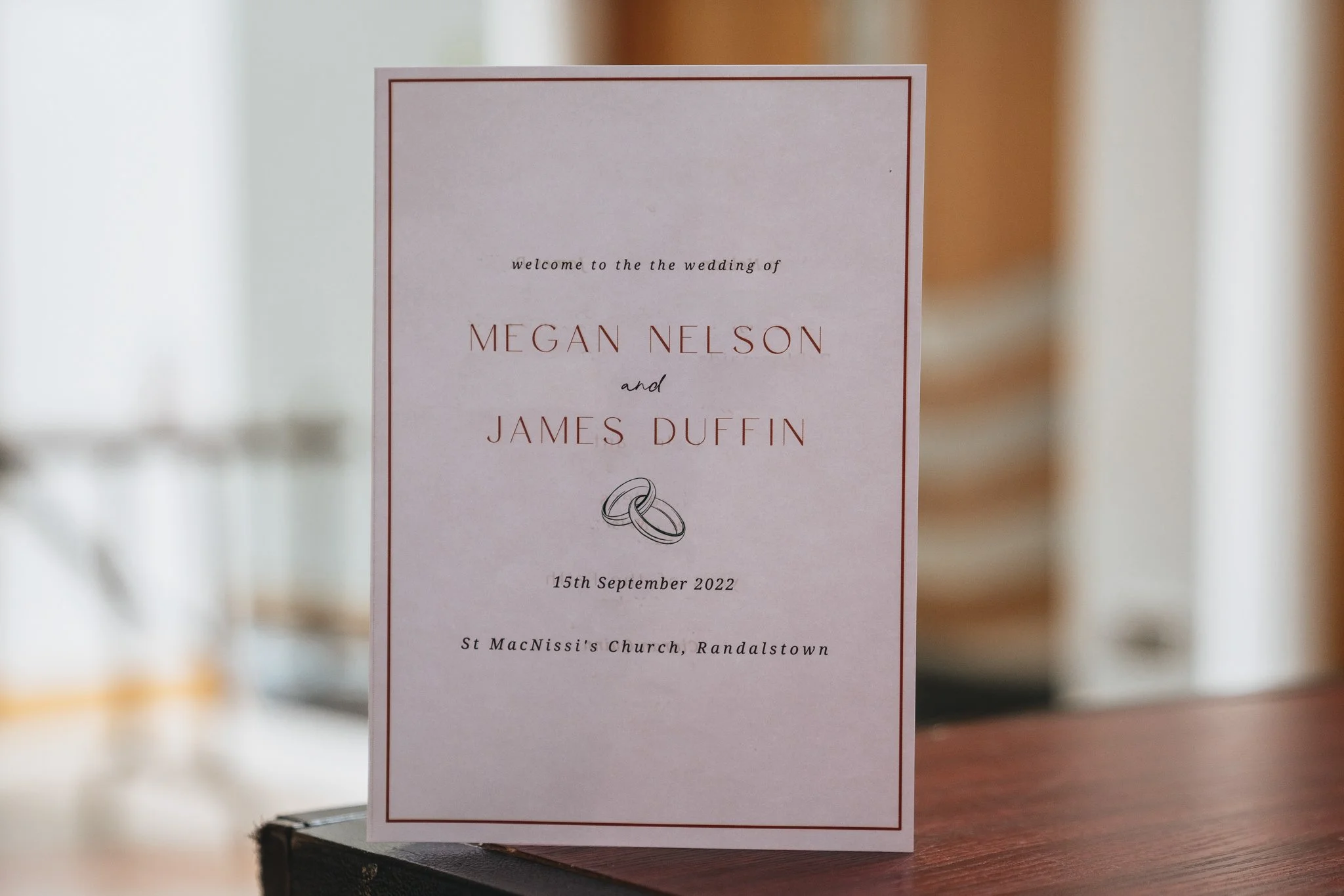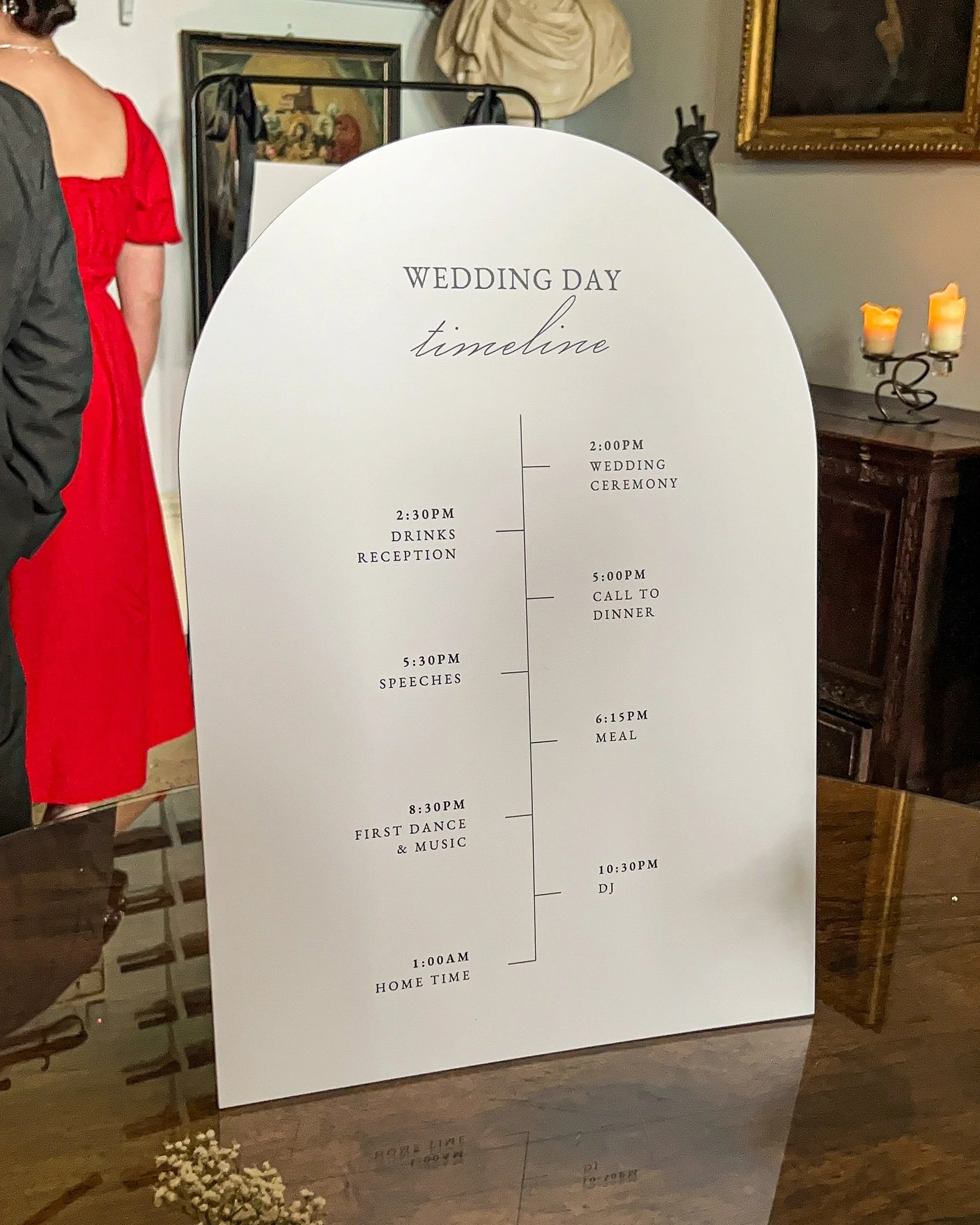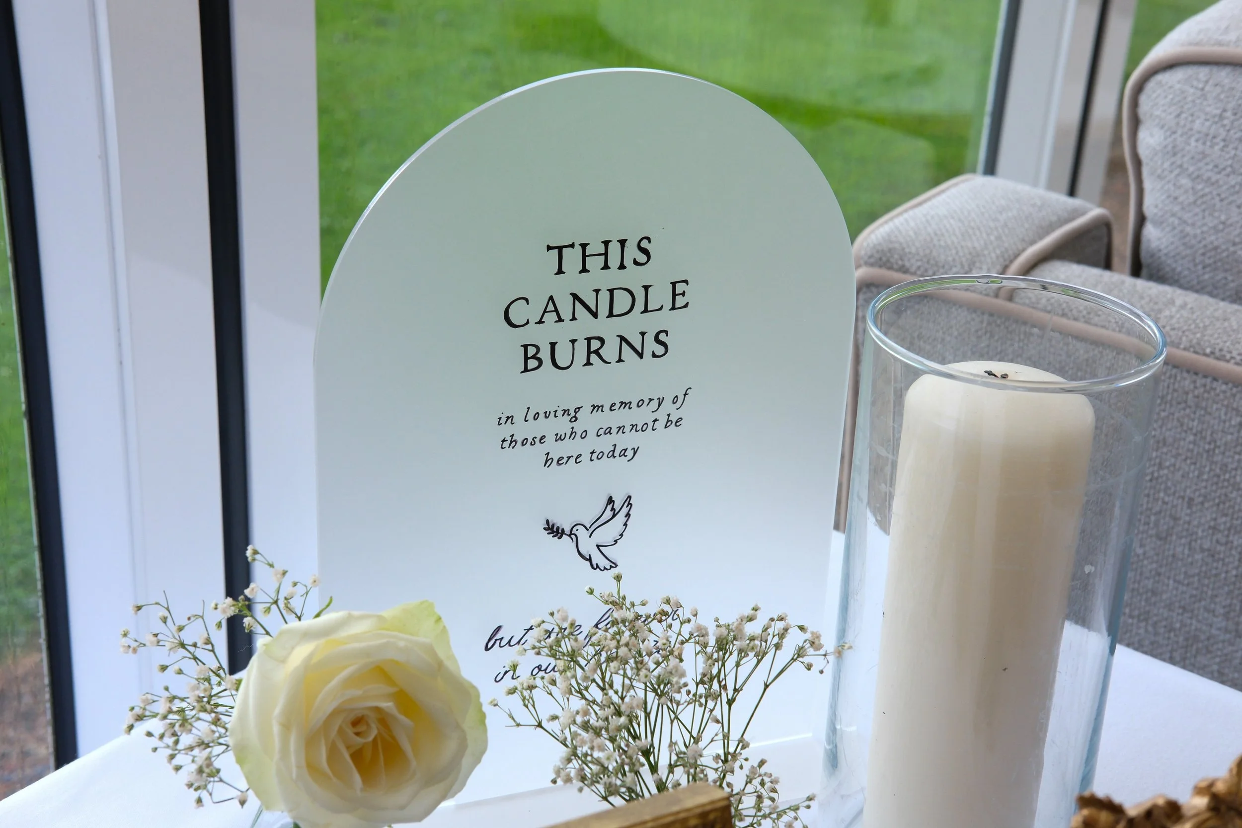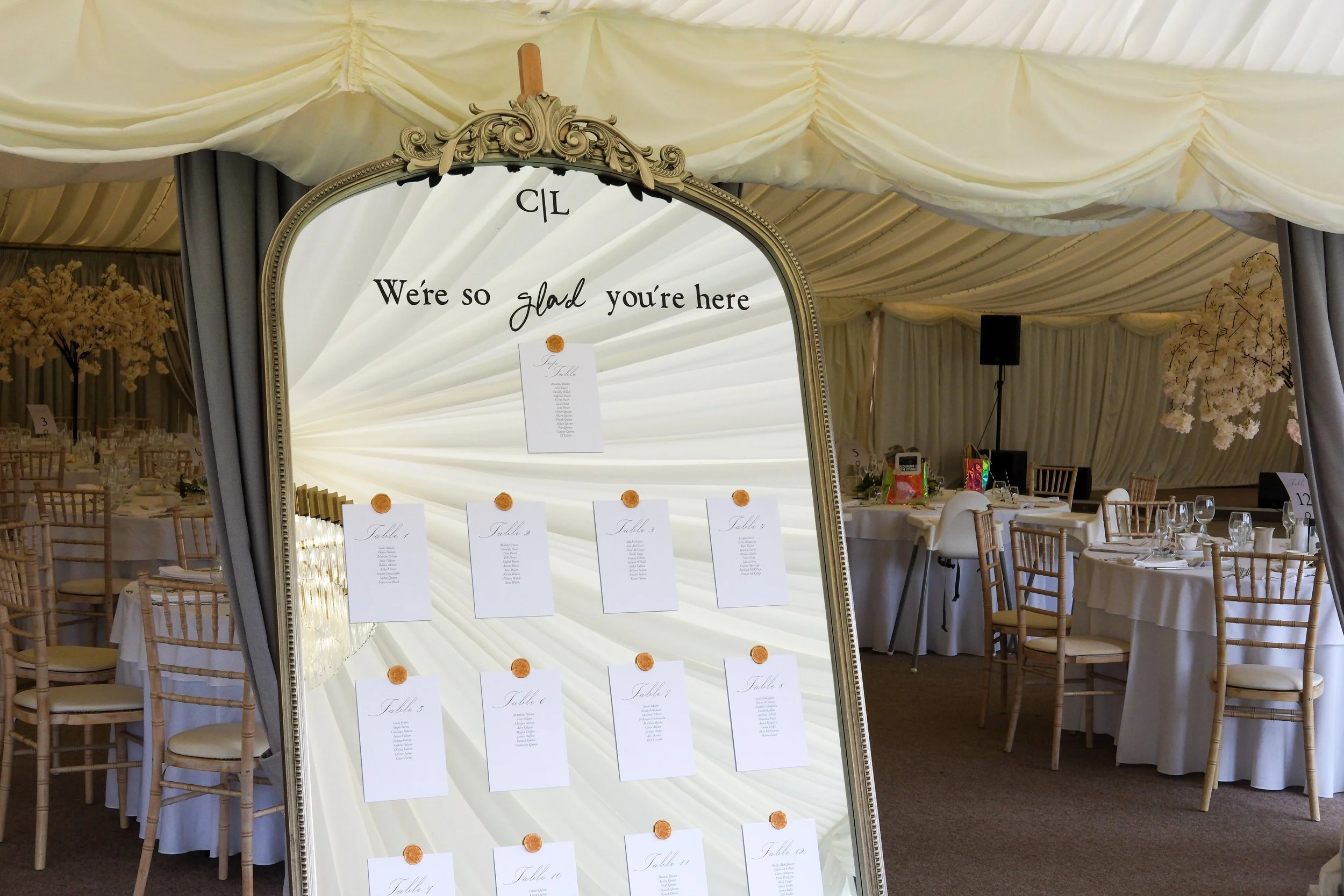 A white sign with black text that says "We're so glad you're here. Please sign our guest book". The sign is placed on a table next to a glass container with brown envelopes and white flowers, near a window with a garden view.