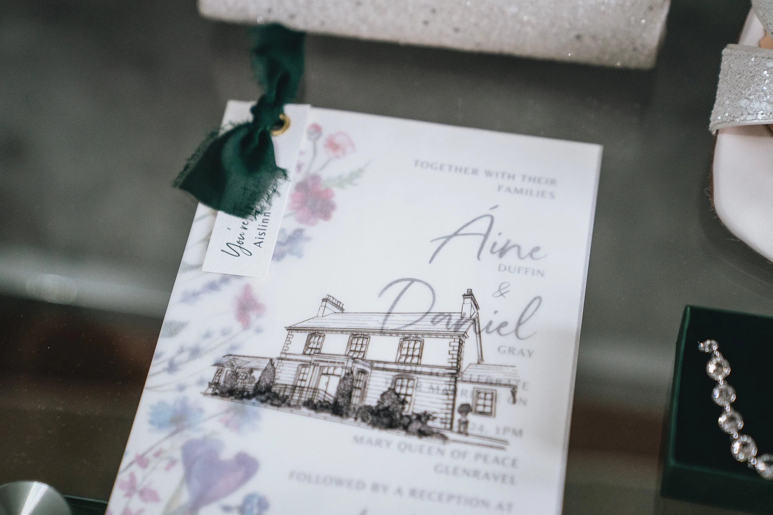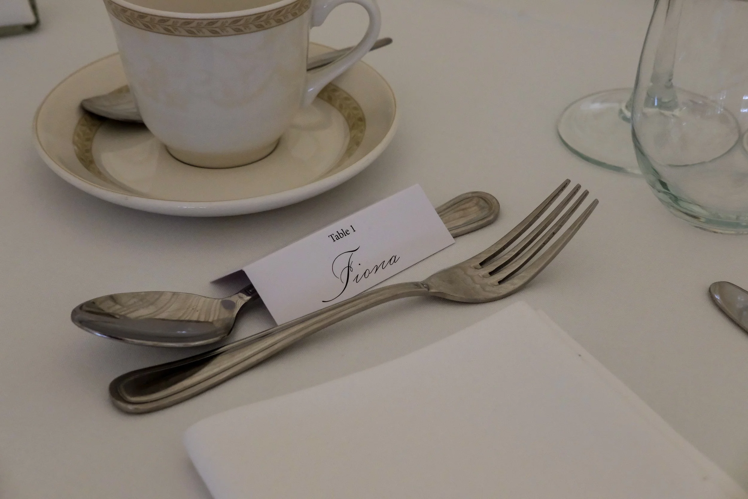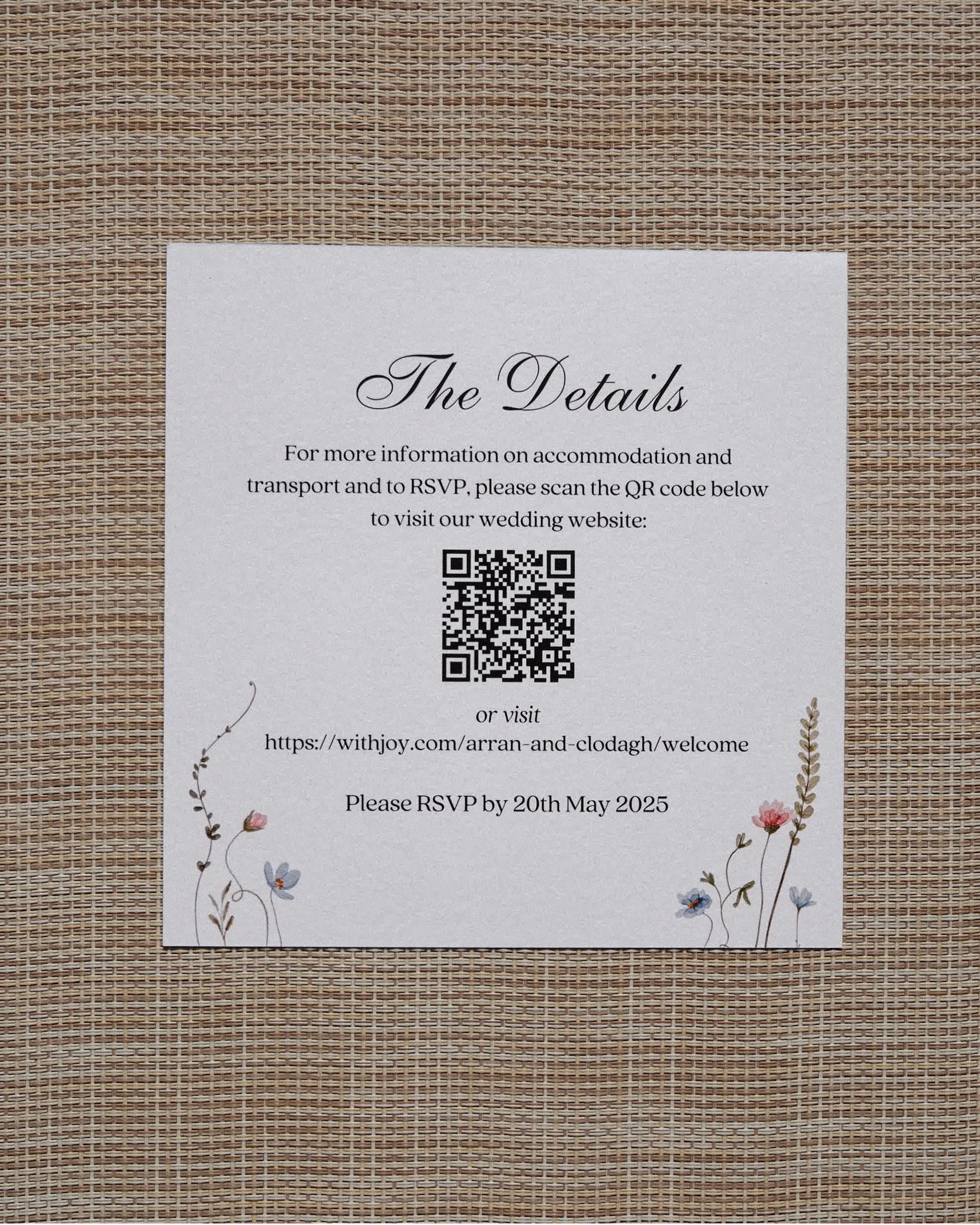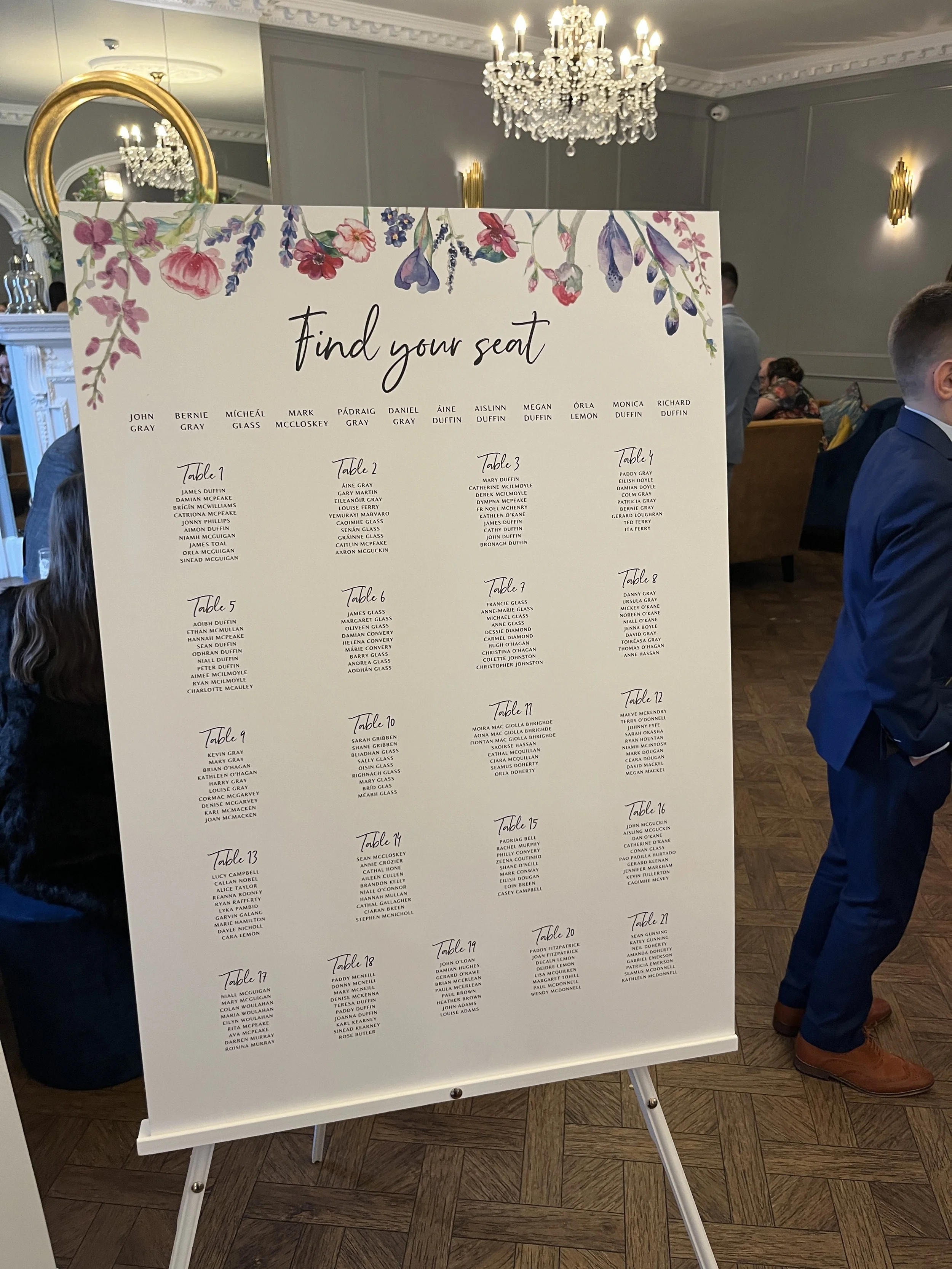 A white sign with black text that says "We're so glad you're here. Please sign our guest book". The sign is placed on a table next to a glass container with brown envelopes and white flowers, near a window with a garden view.