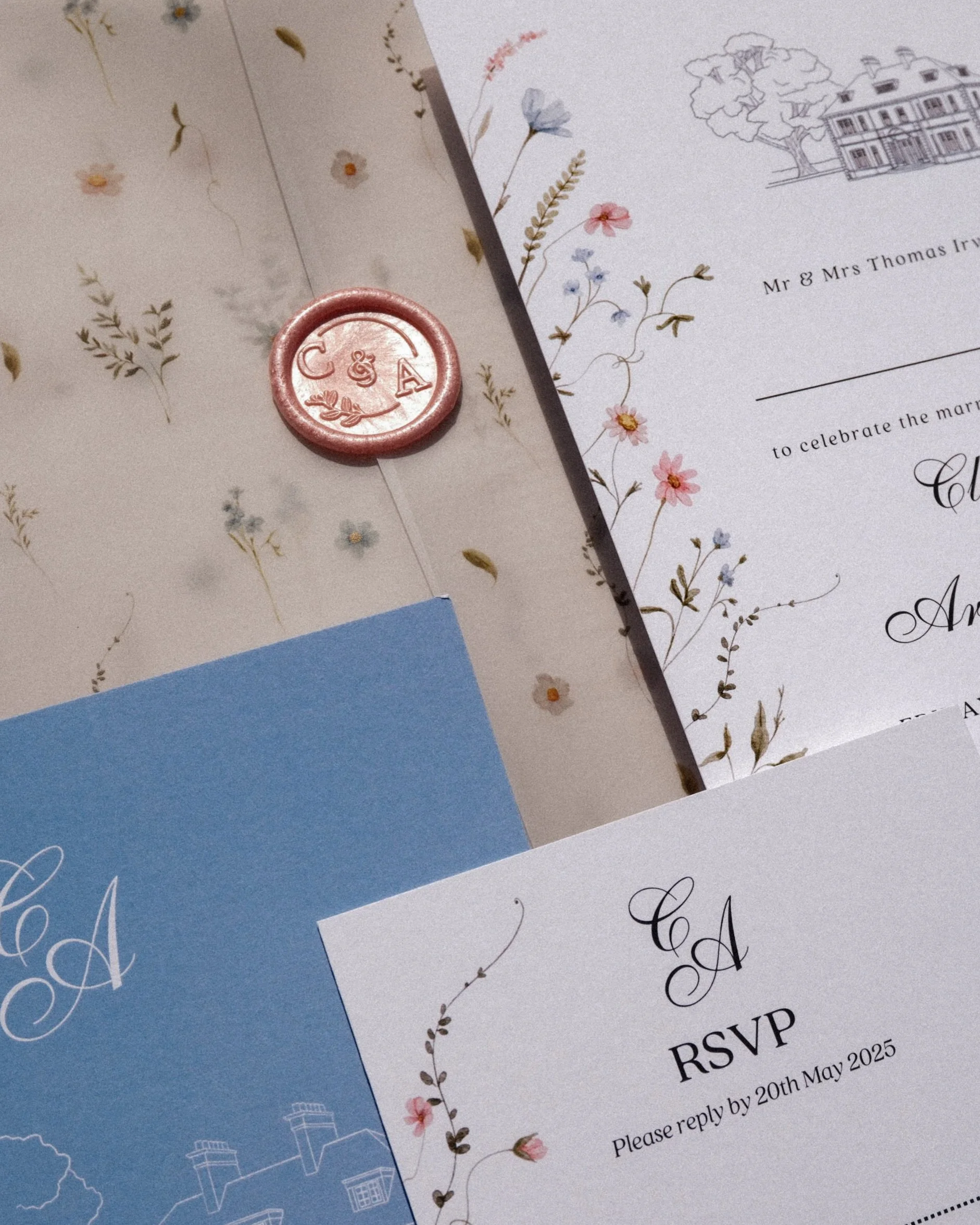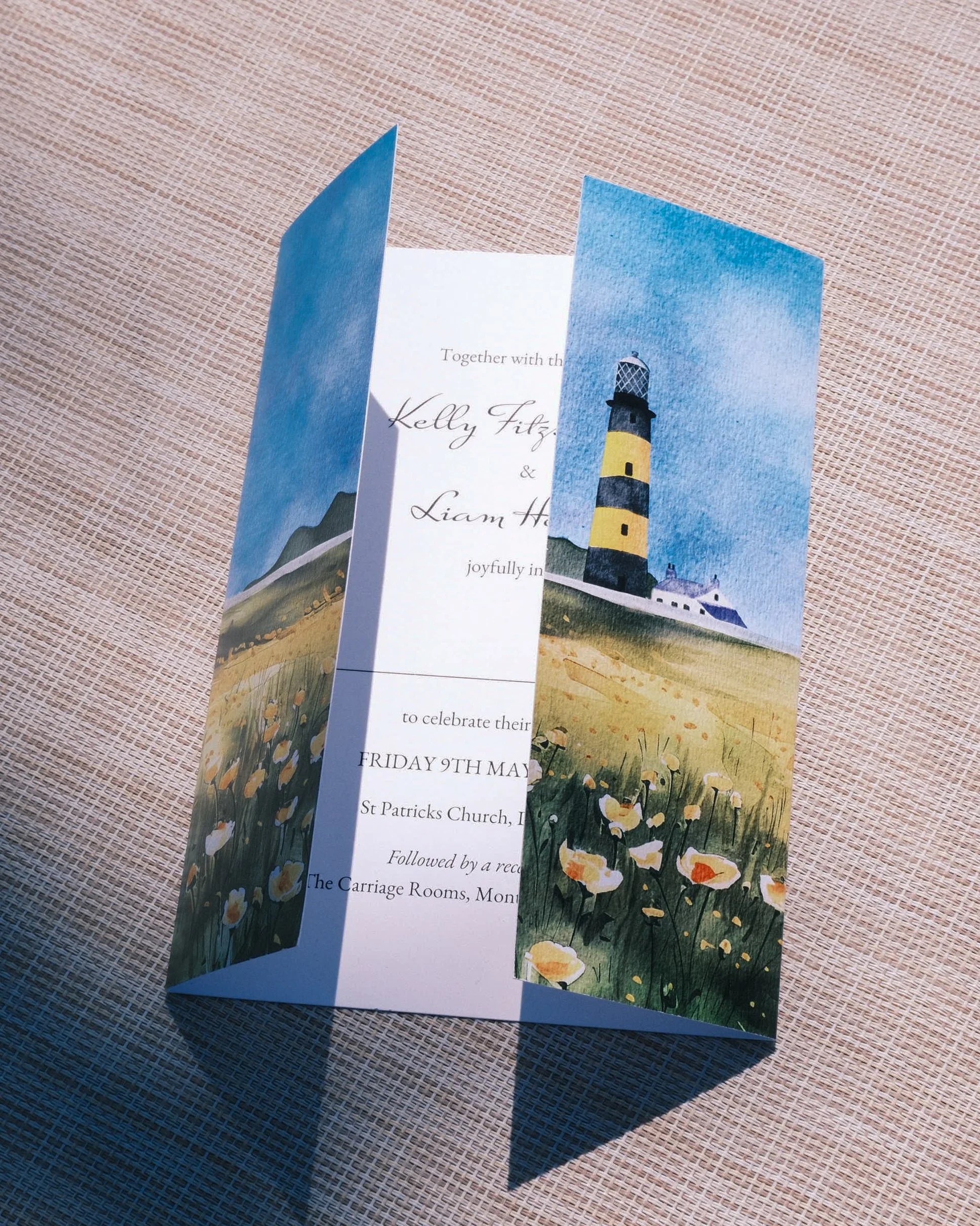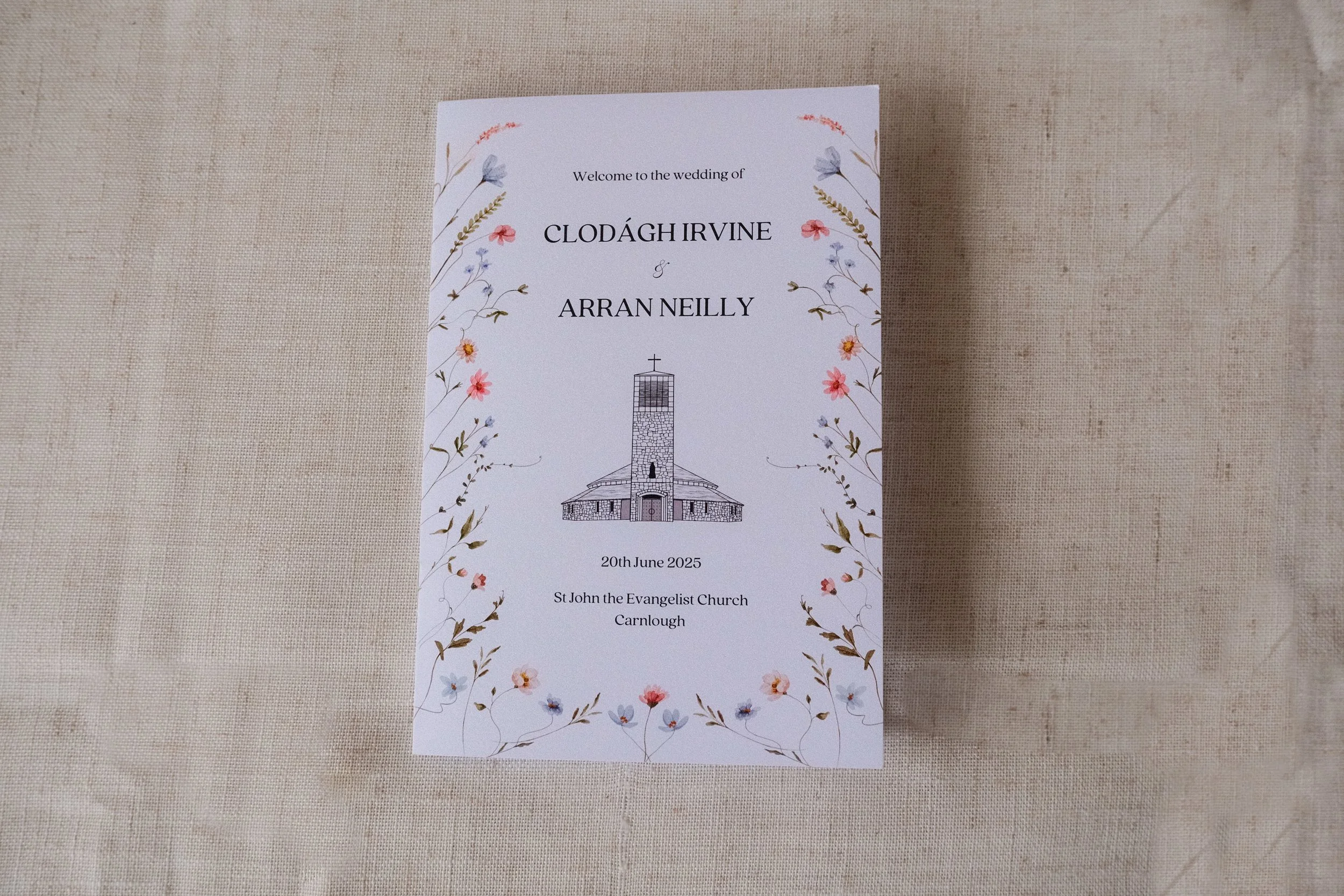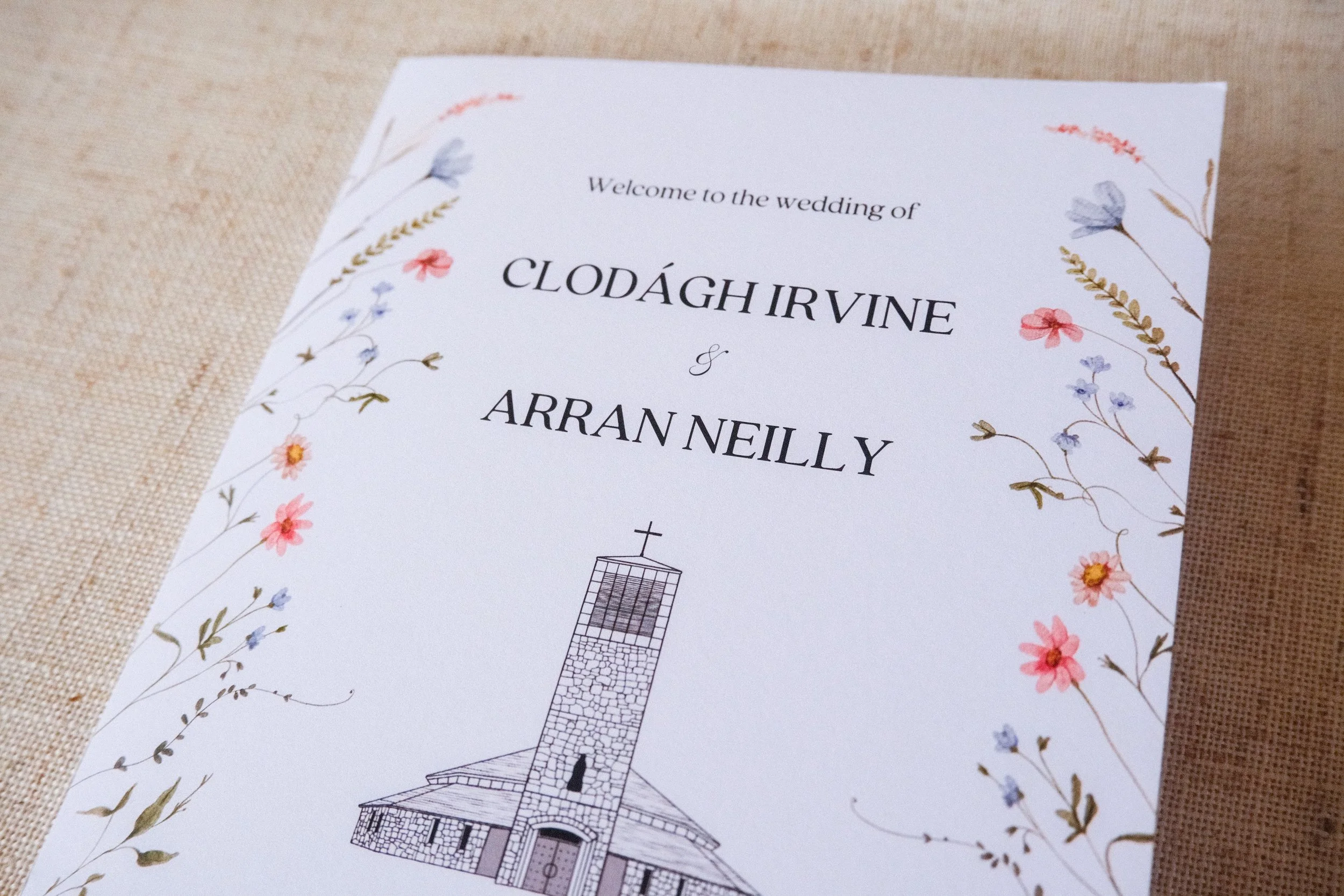A white sign with black text that says "We're so glad you're here. Please sign our guest book". The sign is placed on a table next to a glass container with brown envelopes and white flowers, near a window with a garden view.