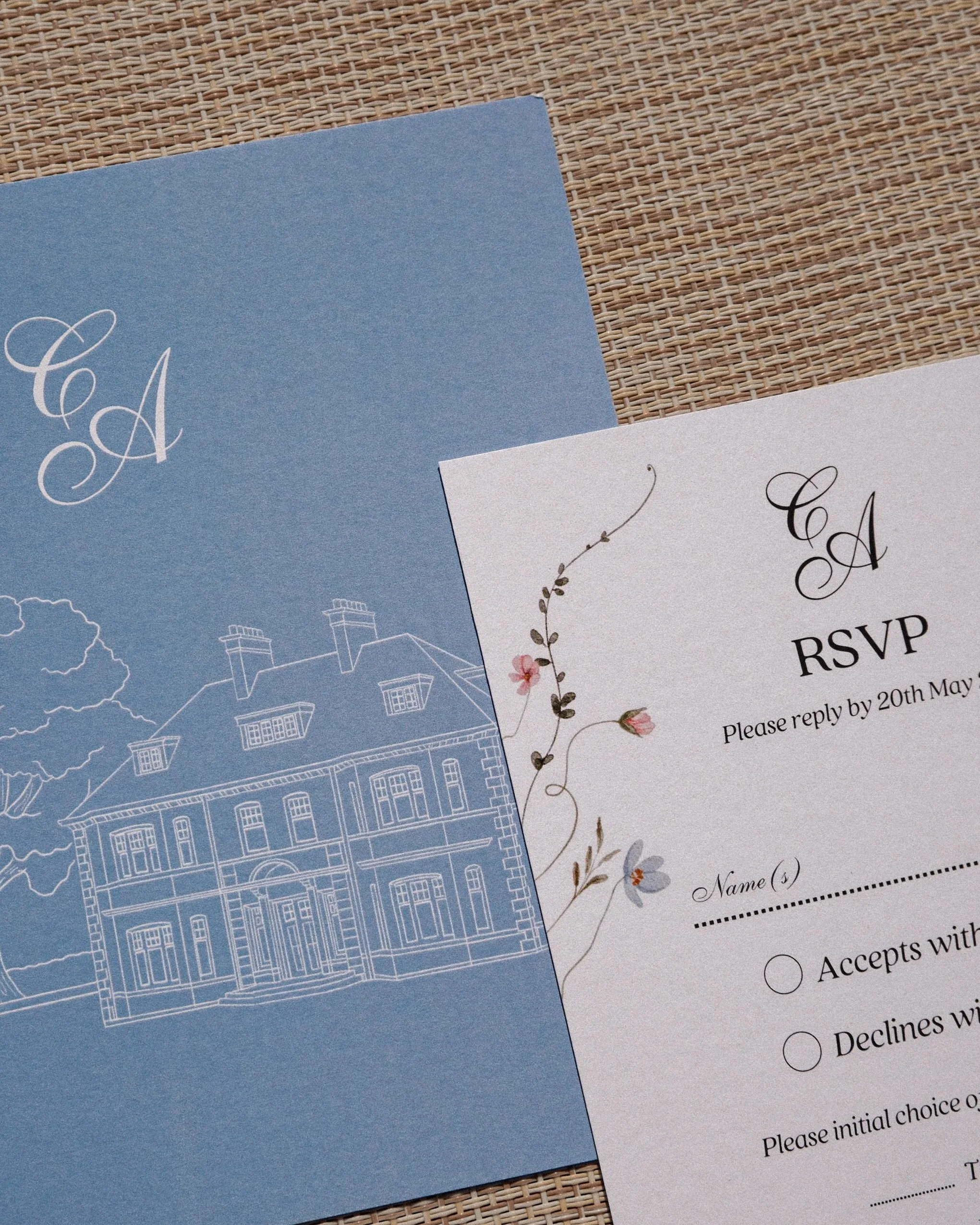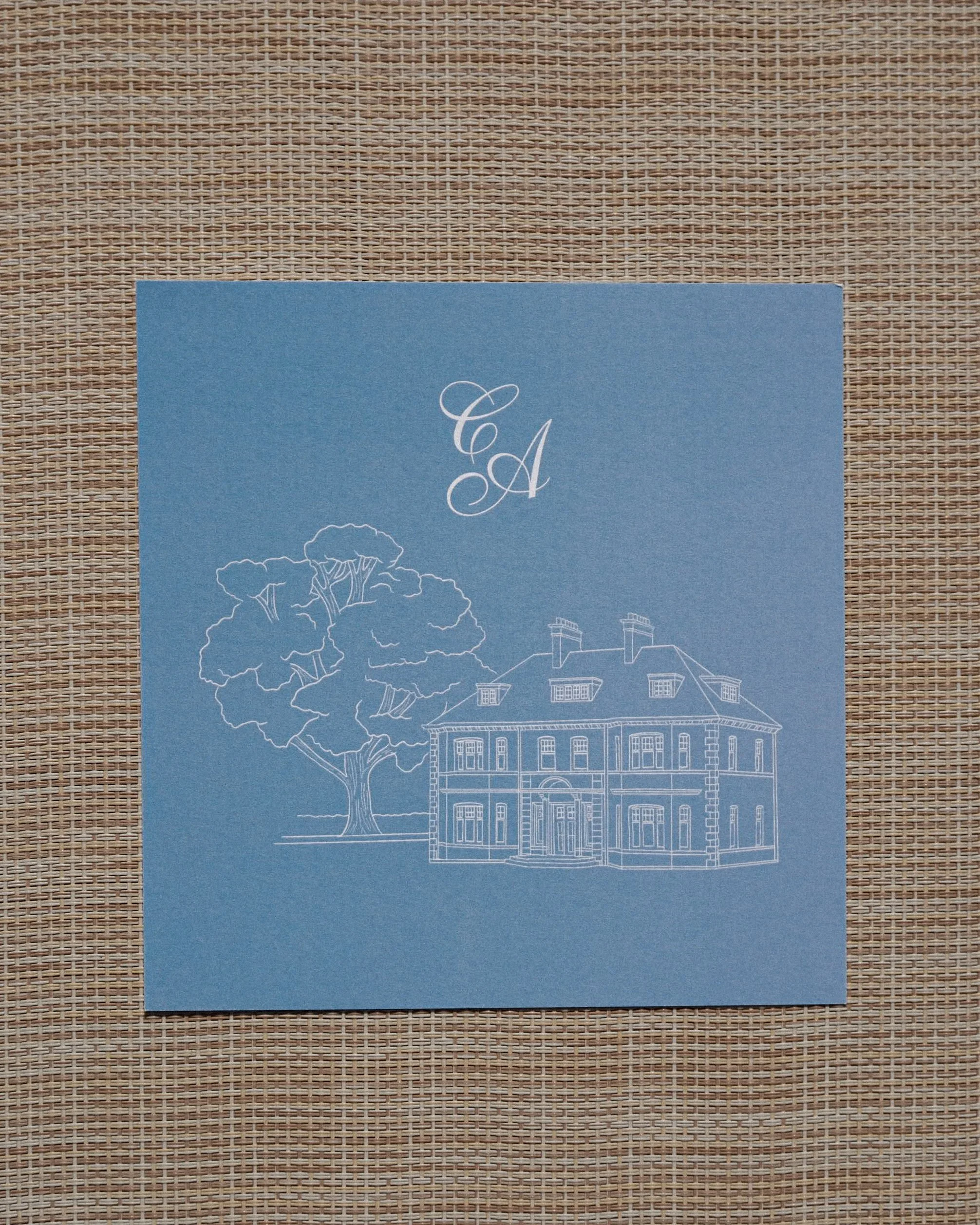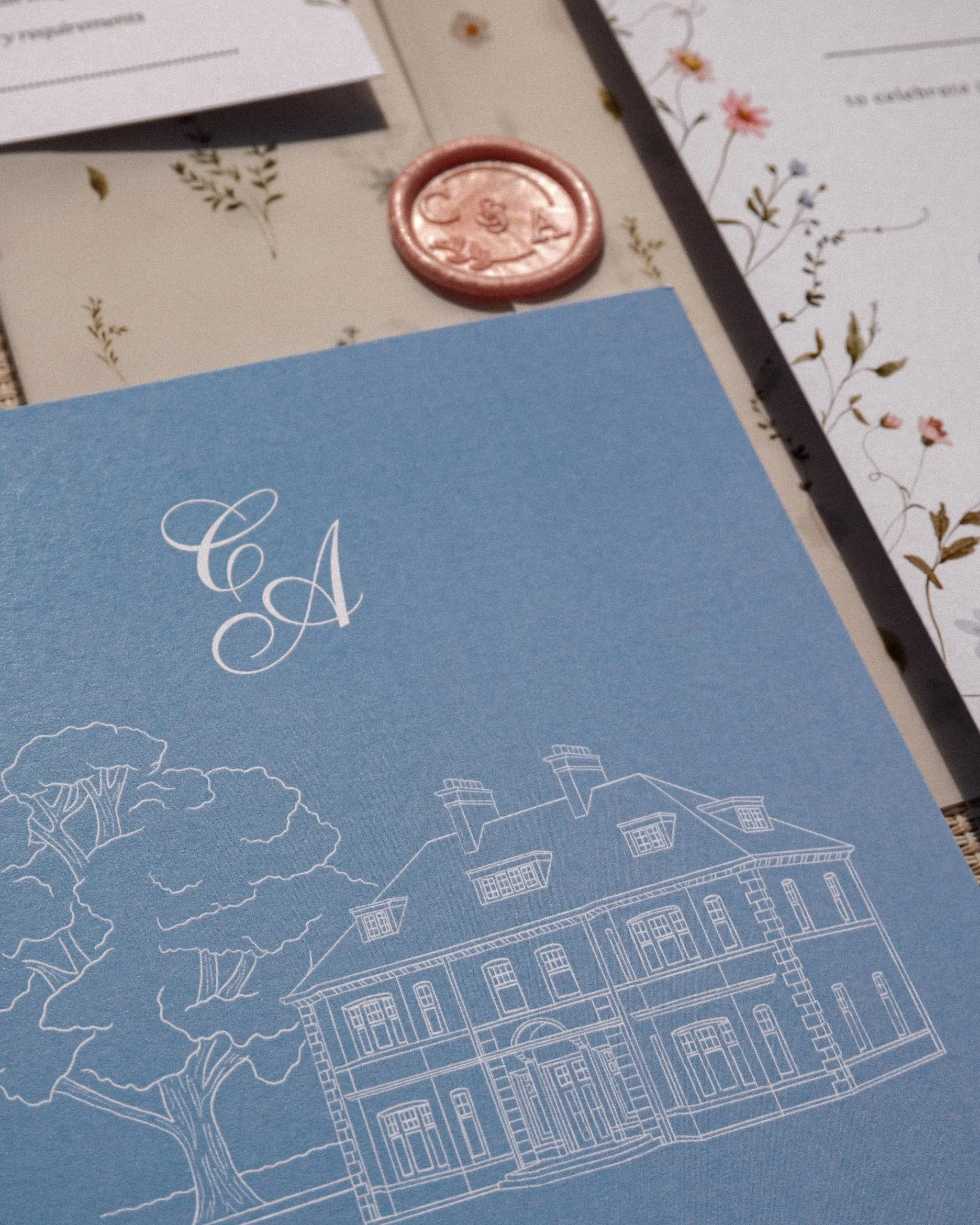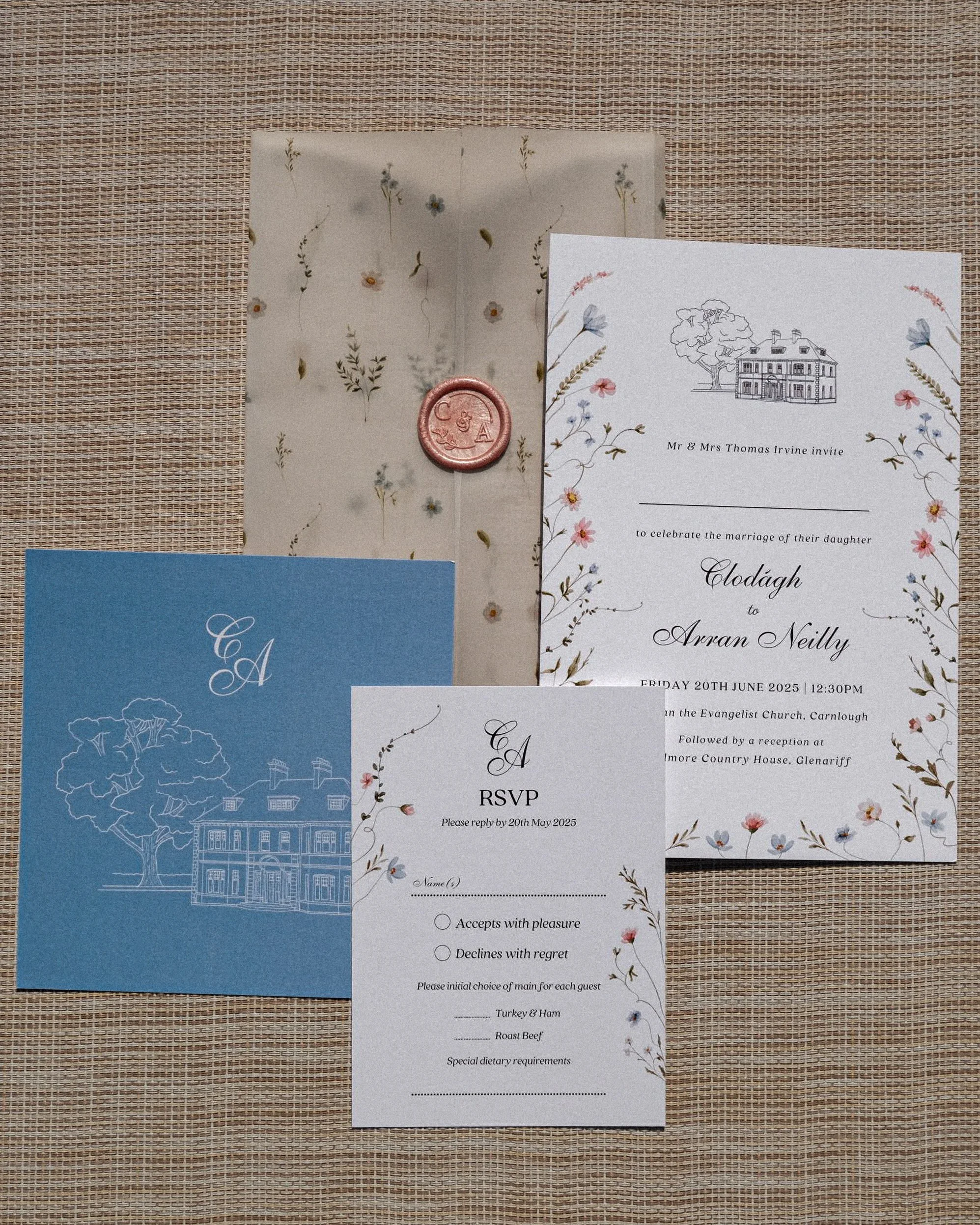A white sign with black text that says "We're so glad you're here. Please sign our guest book". The sign is placed on a table next to a glass container with brown envelopes and white flowers, near a window with a garden view.